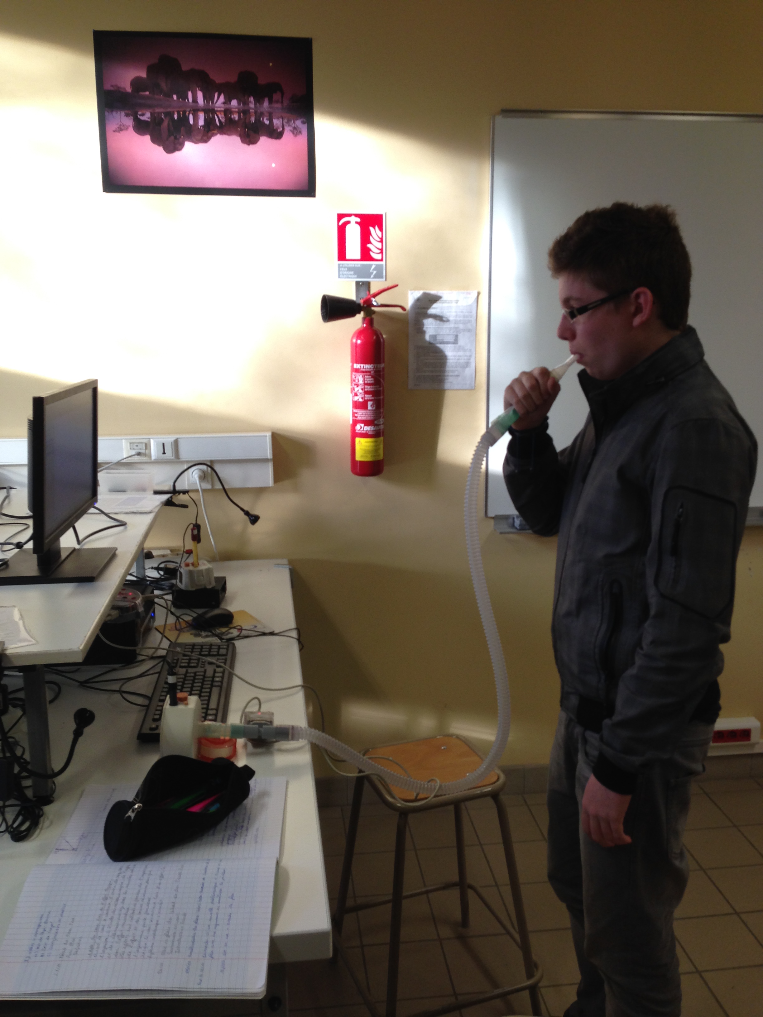 Notre lycée est équipé d'une salle EXAO (Expérimentation Assisté par Ordinateur) dans laquelle nous avons pu réaliser nos tests. Nous nous sommes équipés d'un capteur de débit ventilatoire ainsi que d'un capteur de dioxygène.