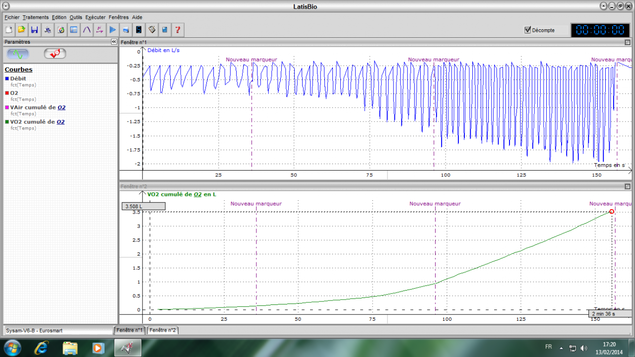 Le procédé mathématique, appelé le nommogramme, utilisé principalement pour des calculs peut concret, ne convient pas pour l'exercice du calcul de la VO2max qui doit être à la pointe de la précision. Nous allons alors privilégier le test EXAO, qui reste encore le moyen le plus précis pour ce genre de calcul.En effet, avec le test EXAO, on obtient une VO2max de 3,7732 L/min or, on obtient 3,6 L/min avec le nomogramme.Grâce à la salle EXAO, nous avons pu calculer à l'aide du logiciel LatisBio, d'autres informations tels que le débit ventilatoire et la VO2 en L :